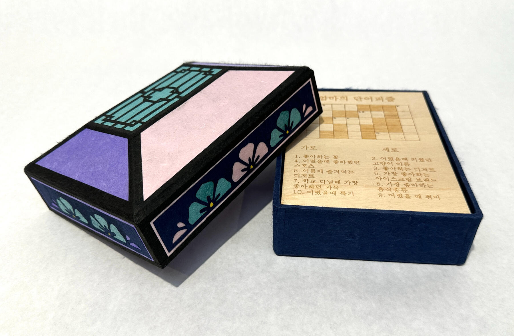 A handmade box using chipboard and hanji filled with chocolates made from clay. This box was made as an interactive candy box specifically for my mother. Each numbered container holds a chocolate that correlates with the number on the crossword puzzle about my mother.