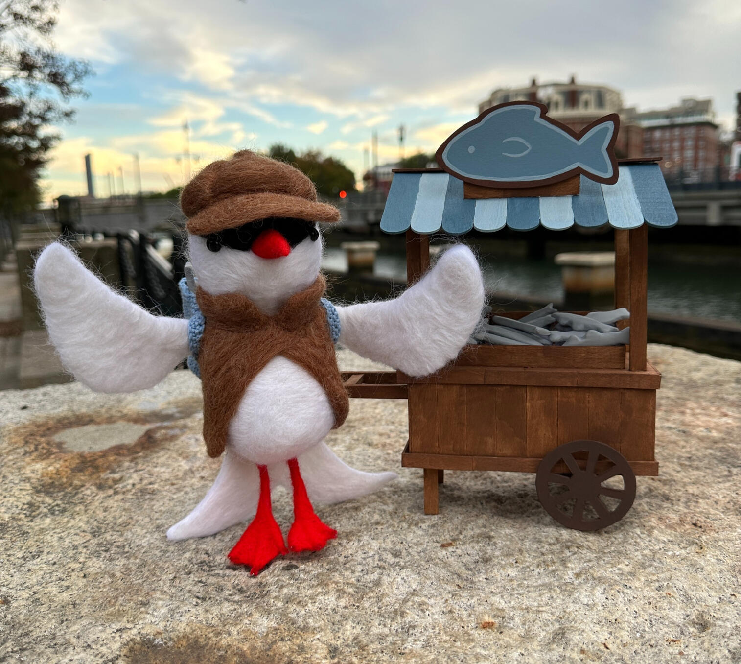 An Arctic Tern that travels the world selling fish. The bird was made from needle felting and its bag was crocheted while the fish cart was made from popsicle sticks filled with clay fish.