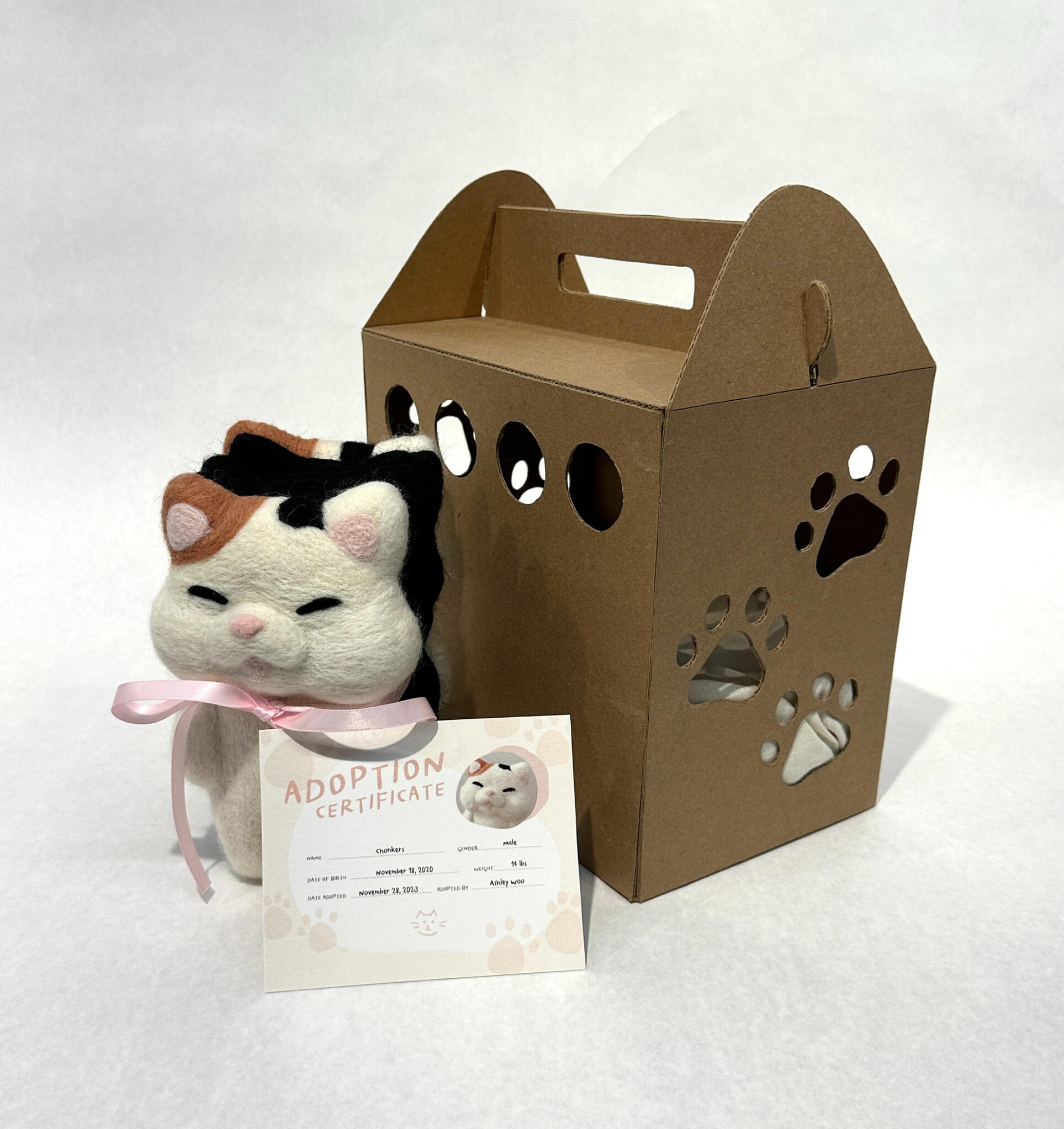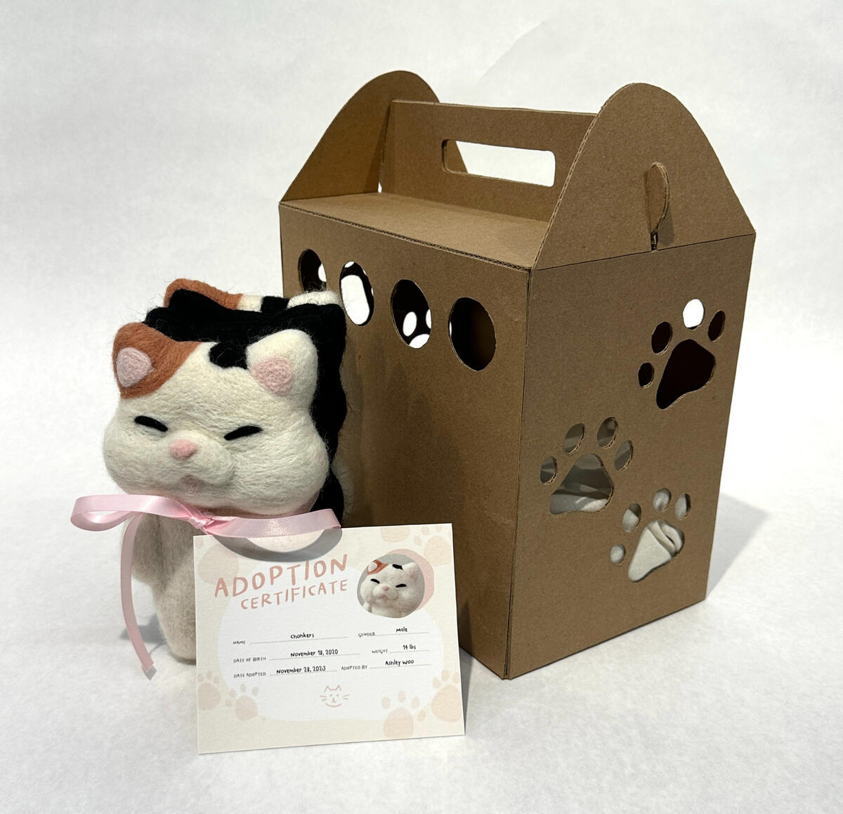 A needle felted book of a cat. Each page shows the inner workings of a cat such as their skeleton or diet.