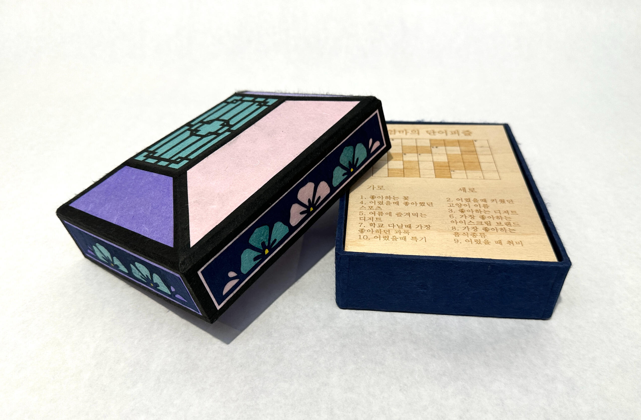 A handmade box using chipboard and hanji filled with chocolates made from clay. This box was made as an interactive candy box specifically for my mother. Each numbered container holds a chocolate that correlates with the number on the crossword puzzle about my mother.