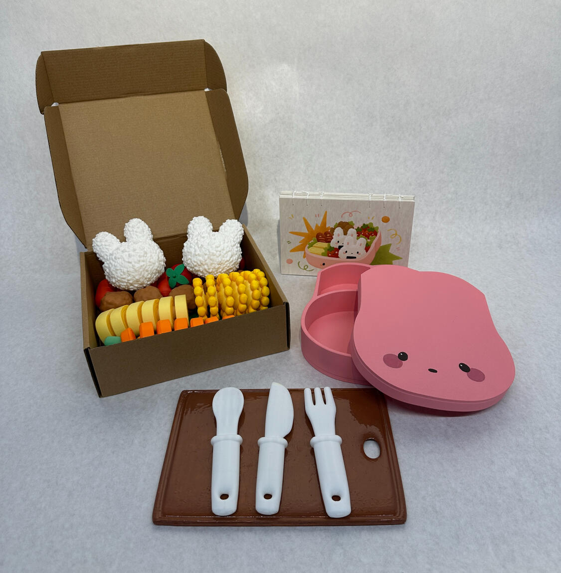 This is a toy design that lets children build their own bento box. Children are able to explore many different combinations through placement of food and designing their own decorations for certain foods such as the onigiri. The target age range for this product would be around the ages of 3 to 7 years old. While designing this toy, I was considering ways in which this product could promote sensory play, learning about sharing and communicating with others, and decision making.Each bento box set would have a different theme and design, and each themed set would come with different foods that would differentiate it from other sets. Some of the items that would be in every bento box set would be a bento box, food items, utensils, cutting board, colored sticker sheets, and an illustrated book with an explanation of each food.